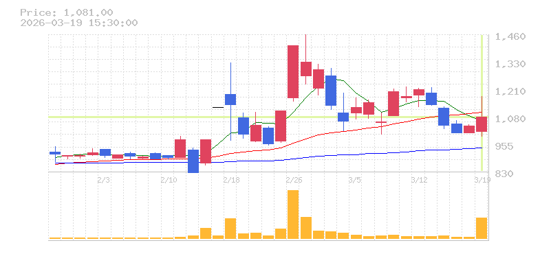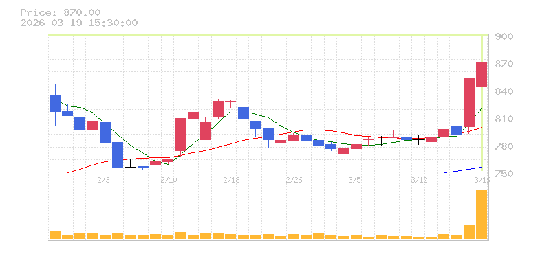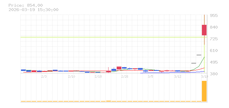 | +3.84% | 26.84倍 前日: 30,200 今日: 810,700 | 75 ※検知後推定 上昇出来高 217,100 下降出来高 220,600 -3,500 | 陽線 始:1015 高:1175 安:993 乖:6.5% vwap:1102.4 stop:1091.4 - 15:57 AI診断 | |