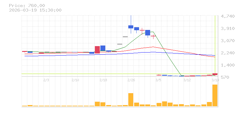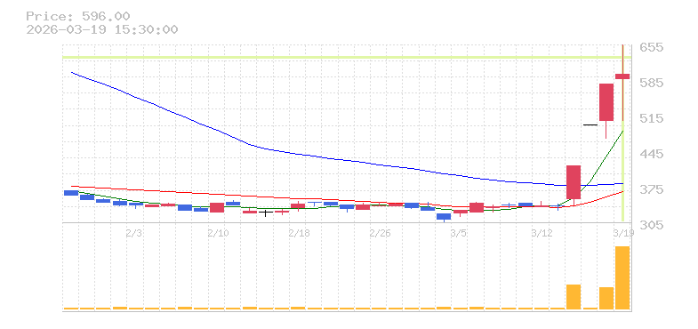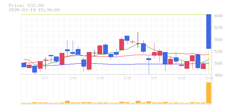 | +3.29% | 2.98倍 前日: 1,778,500 今日: 5,301,900 | 70 ※検知後推定 上昇出来高 1,458,100 下降出来高 2,193,500 -735,400 | 陽線 始:587 高:656 安:505 乖:1.53% vwap:575 stop:569.3 - 15:57 AI診断 | |