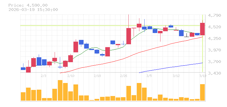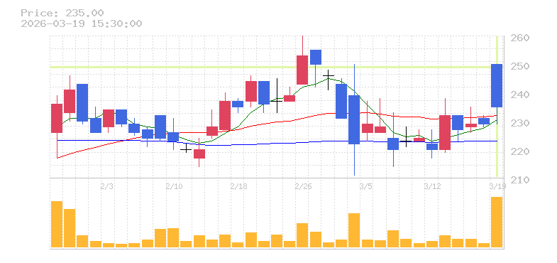 | +6.62% | 12.15倍 前日: 2,000 今日: 24,300 | 80 ※検知後推定 上昇出来高 3,700 下降出来高 9,500 -5,800 | 陽線 始:4305 高:4650 安:4305 乖:6.62% vwap:4523.5 stop:4478.3 ★ 15:57 AI診断 | |