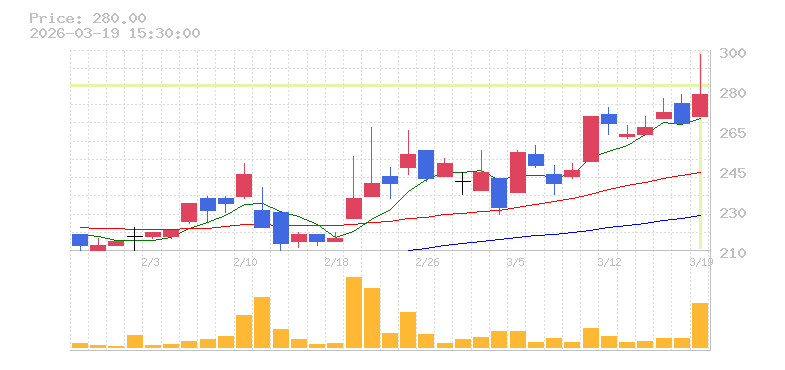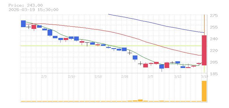 | +0.78% | 29.17倍 前日: 245,600 今日: 7,163,700 | 70 ※検知後推定 上昇出来高 2,236,500 下降出来高 4,631,800 -2,395,300 | 陽線 始:257 高:299 安:253 乖:0% vwap:275.2 stop:272.4 - 15:57 AI診断 | |