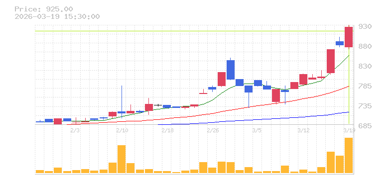 | +5.11% | 2.07倍 前日: 33,700 今日: 69,800 | 70 ※検知後推定 上昇出来高 4,200 下降出来高 6,000 -1,800 | 陽線 始:876 高:930 安:870 乖:5.59% vwap:906.6 stop:897.5 - 15:57 AI診断 | |