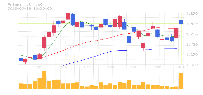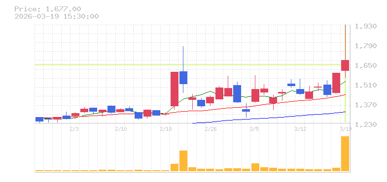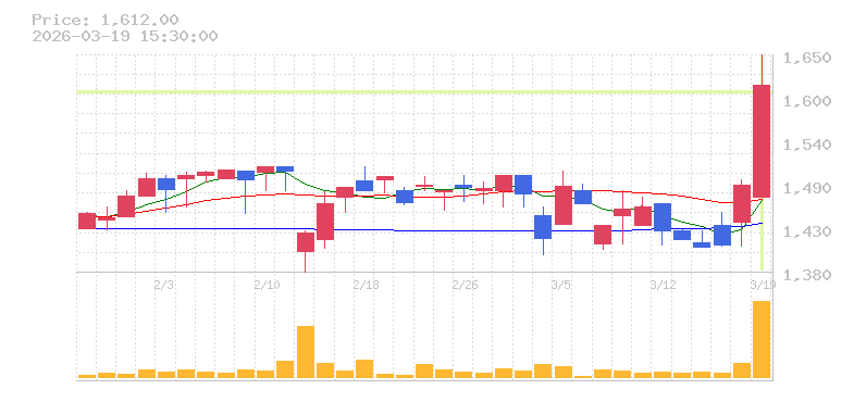 | +8.33% | 5.64倍 前日: 17,700 今日: 99,800 | 75 ※検知後推定 上昇出来高 21,500 下降出来高 43,700 -22,200 | 陽線 始:1472 高:1650 安:1472 乖:9.51% vwap:1585.1 stop:1569.2 ★ 15:57 AI診断 | |