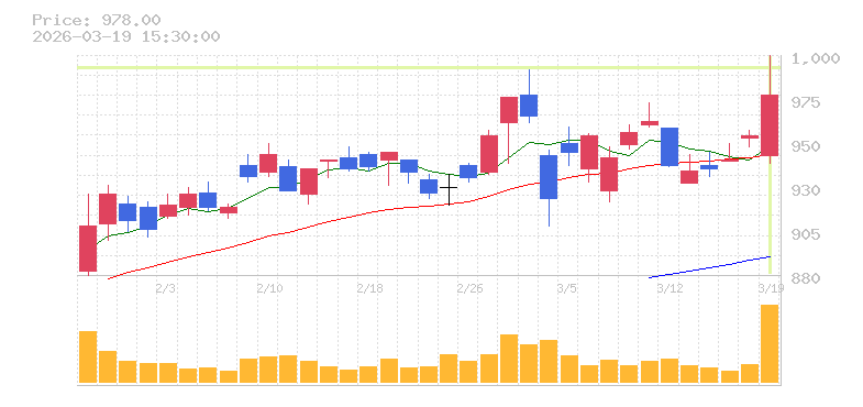 | +2.30% | 4.41倍 前日: 861,200 今日: 3,794,100 | 75 ※検知後推定 上昇出来高 0 下降出来高 700,300 -700,300 | 陽線 始:945 高:1003 安:941 乖:3.49% vwap:975.1 stop:965.3 - 15:57 AI診断 | |